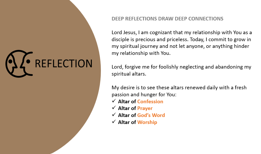 Don’t let disappointments in life put a pause on the rebuilding of the four spiritual altars of confession, prayer, God’s Word and worship. God shows up and responds to us at these altars.