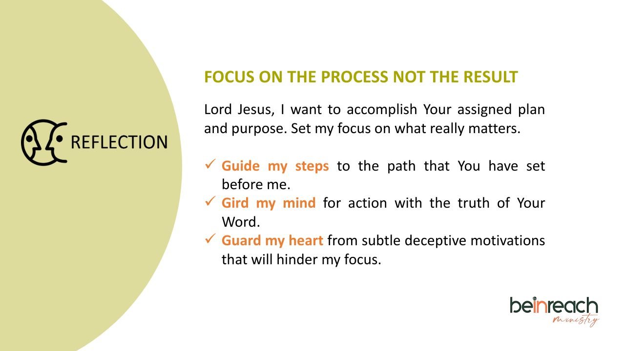 Therefore, it is imperative that we learn to focus on God - one step at a time because “He delights in every detail of (our) lives. Though they stumble, they will never fall, for the Lord holds them by the hand.” (Psalm 37:23-24 NLT paraphrased). Details of our progress are found in the process, not the result.