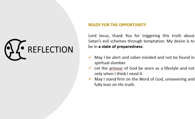 Finally, “When the devil had finished all this tempting, he left Him until an opportune time.” Notice that Scripture never suggested that the enemy left Jesus for good, once for all. In the same way that he was never done with Jesus, he is never done with us. He will keep up his scheming and strategies till you are totally defeated and either give up on living, or give up on Jesus.